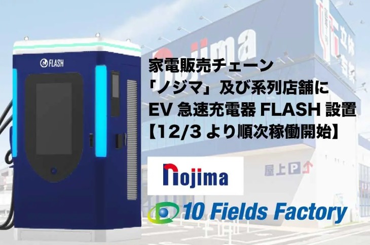 テンフィールズファクトリー株式会社(本社:京都府相楽郡精華町、代表取締役:市川 裕)は、大手家電量販店チェーンを展開する株式会社ノジマが運営する3店舗において、当社EV急速充電器「FLASH」の設置および稼働を開始いたします。